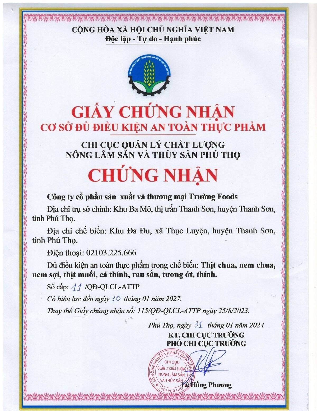 Trường Foods là thương hiệu số 1 sản xuất Thịt Chua, nức tiếng ở vùng đất Tổ Phú Thọ. Tiền thân của công ty Trường Foods là cơ sở sản xuất thịt chua Nghị Thịnh. Sau hơn 10 năm sản xuất và phân phối ngày 02/06/2015 công ty Trường Foods được thành lập và đổi tên thành thịt chua Trường Foods.